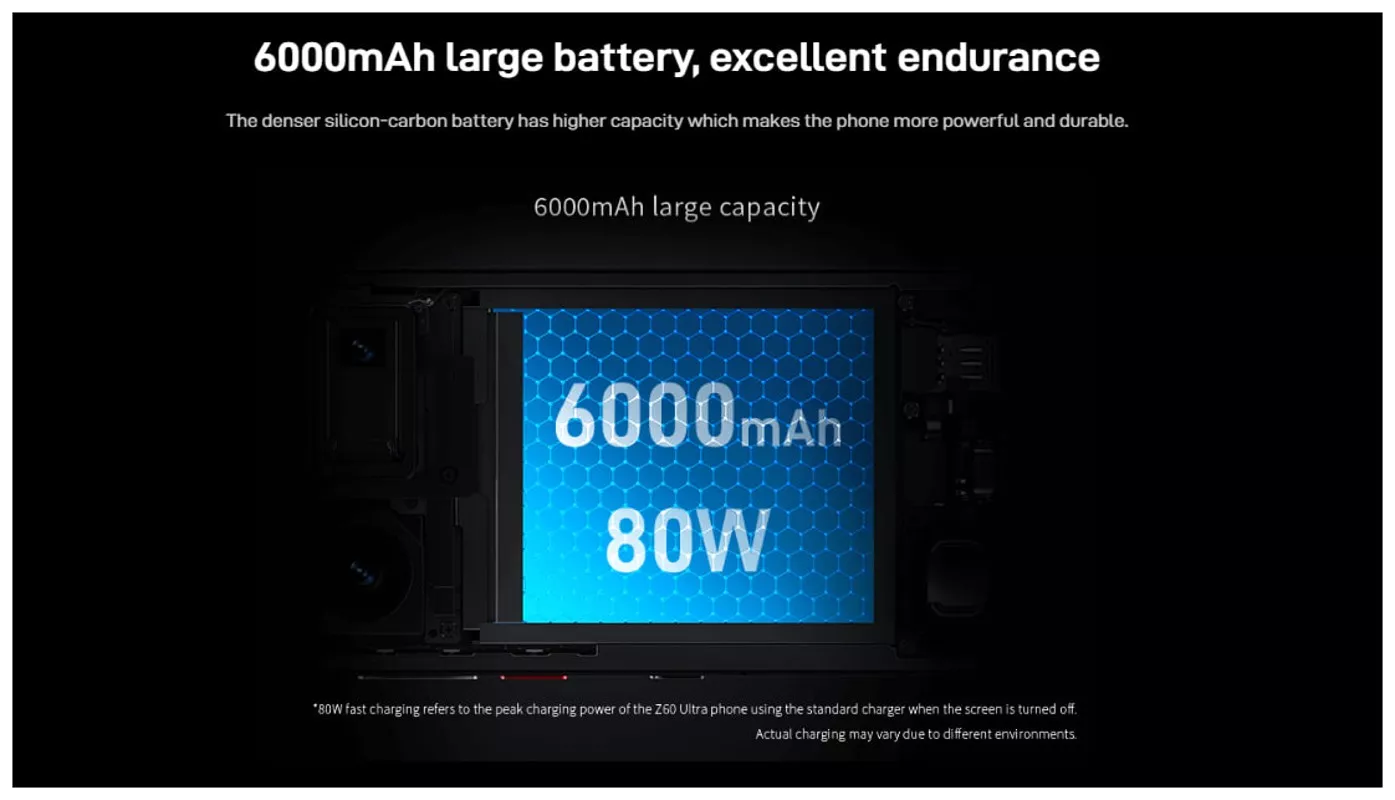 Батарея ZTE Nubia Z60 Ultra обеспечивает долгое время автономной работы, что позволит вам использовать устройство весь день без необходимости частой зарядки.