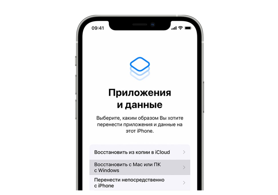 Когда ПК будет готов, включите новый iPhone и продолжайте его настройку до появления экрана «Перенос приложений и данных». На нем выберете опцию «Восстановить с Mас или ПК с Windows», подключите новый смартфон к компьютеру и запустите передачу.