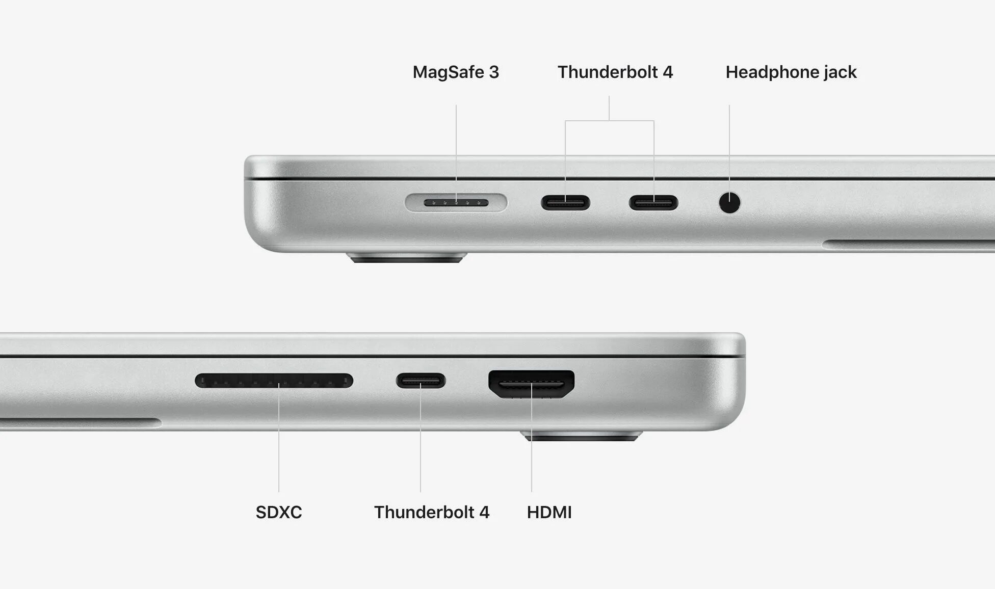 Модель MacBook Pro c чипом M5 позволяет подключать различные внешние устройства благодаря богатому набору разъемов: USB-C с технологией Thunderbolt 4, HDMI, MagSafe 3, аудиоразъем 3.5 мм, а также слот для карты памяти. За счет поддержки актуальных стандартов беспроводной связи ноутбук оперативно обменивается данными с другими гаджетами во время кодинга, монтажа, обработки графики и мультимедиа.