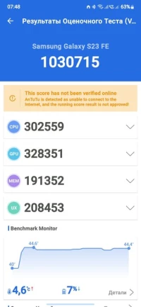 Samsung Galaxy S23 FE работает на базе процессора Exynos 2200, который изготовлен по 4-нанометровому техпроцессу и состоит из восьми ядер: четырех Cortex-A78 с тактовой частотой до 2,8 ГГц и четырех Cortex-A55 с тактовой частотой до 2 ГГц. За графику отвечает GPU Mali-G78 MP14. Этот процессор обеспечивает высокую производительность смартфона во всех сценариях использования: от повседневных задач до игр и мультимедиа.